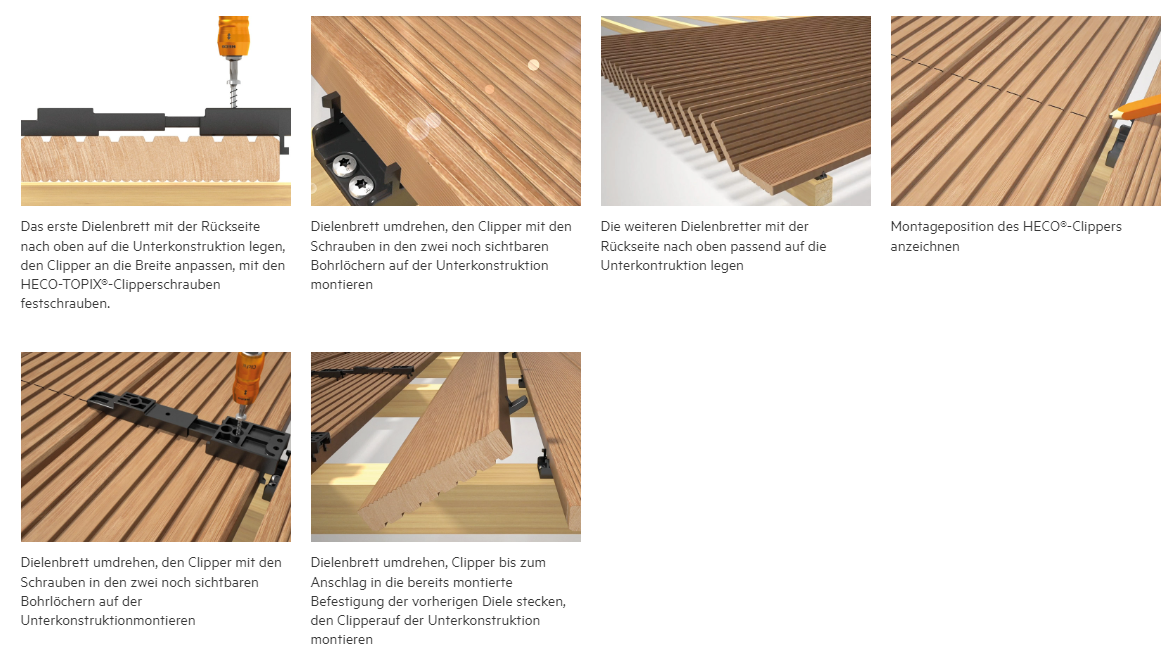 | HECO®-CLIPPER | - Unsichtbare Befestigung inkl. HECO-TOPIX®-Edelstahlschrauben, keine Schrauben in der Belagoberseite |