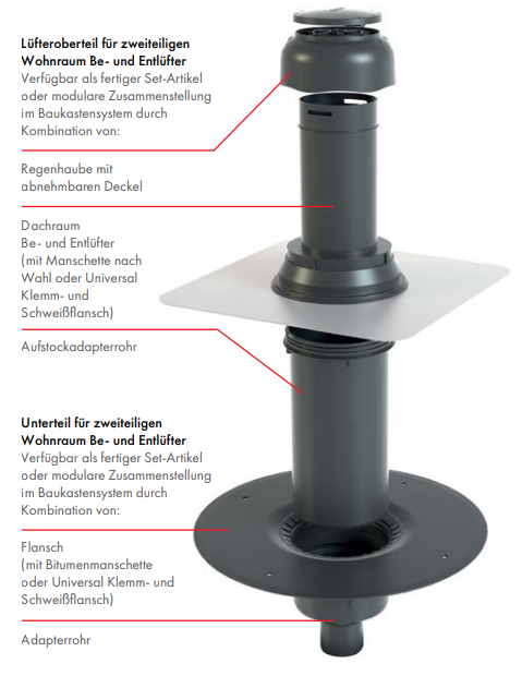 Wohnraum Lüfter DN125/160 - 2-tlg. Bitumen... Flavent Pro wärmegedämmtes Oberteil für zweiteiligen Wohnraum Be- und Entlüfter 125/160 Das Flavent Pro Lüfteroberteil wird in Kombination mit den Flavent Pro Dachablauf als Unterteil für den zweiteiligen Wohnraum Be- und Entlüfter bei...