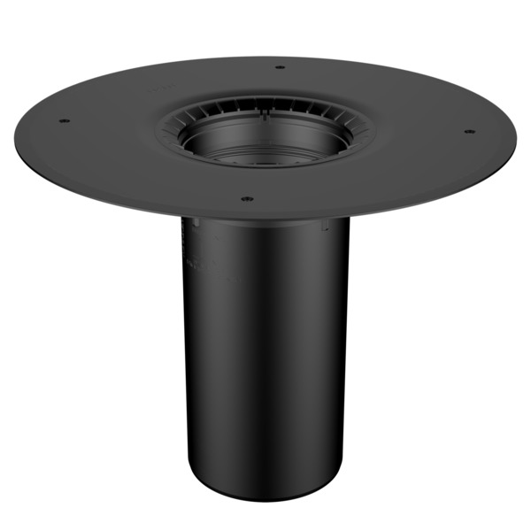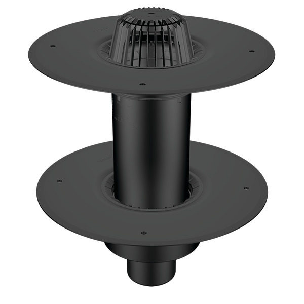 Das Flavent Pro Aufstockelement als Oberteil des zweiteiligen Dachablaufs für Warmdachkonstruktionen senkrecht besticht durch herausragende Ablaufwerte dank einer patentierten, strömungsoptimierten Ablaufgeometrie. Die hohen Abflusswerte übertreffen die Anforderungen der Freispiegelentwässerung gemäß DIN EN 1253 weitläufig. Der Dachablauf ist mit PPO Klemm- und Schweißflansch, vorgefertigter Bitumenmanschette oder vorgefertigter Kunststoffmanschette nach Wahl lieferbar. Die Kunststoffmanschetten aus homogenen Bahnenmaterial ohne unterseitige Vlieskaschierung ermöglichen eine sichere und einfache Verschweißung mit der Flächenabdichtung. Dank der aufgeprägten Skalierung auf dem Aufstockrohr kann das Aufstockelement einfach der individuellen Dämmstoffhöhe angepasst werden. Es ist für alle Durchmesser universell einsetzbar und passt zu allen senkrechten Flavent Pro Dachabläufen. Mit dem Notüberlaufstutzen kann der zweiteilige Dachablauf auch zur Notentwässerungseinheit umgerüstet werden. Alle Flavent Pro Entwässerungsprodukte sind TÜV Bauart geprüft und überwacht.