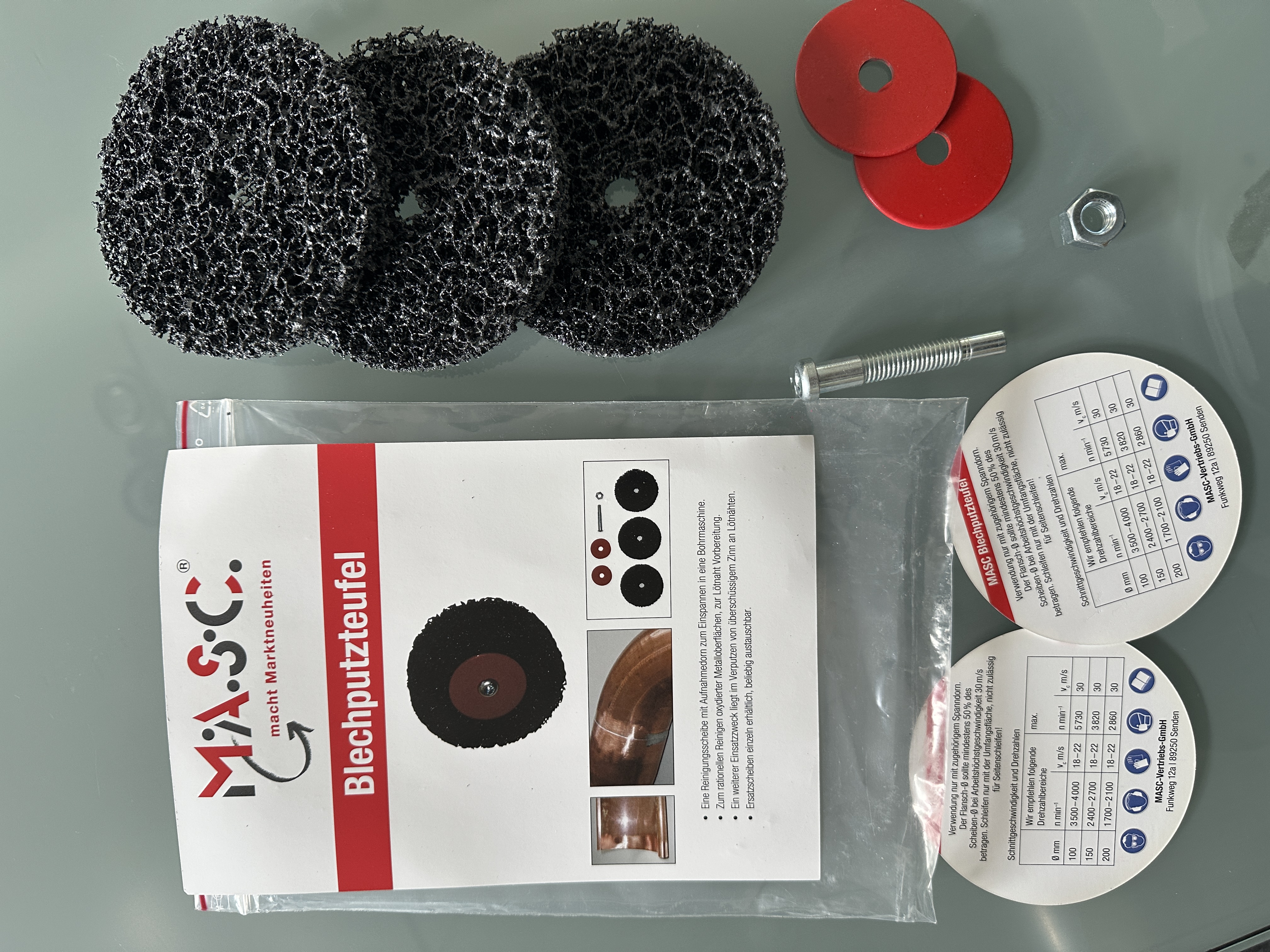 - eine Reinigungsscheibe mit Aufnahmedorn zum Einspannen in eine Bohrmaschine