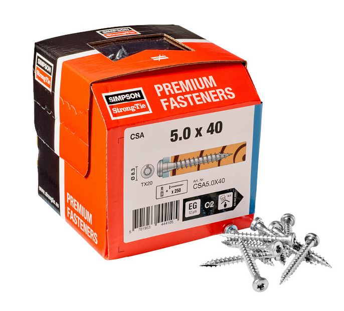 CSA-Schrauben Ø 4.0 und Ø 5.0 mm sind speziell für Stahlblech-Holz-Verbindungen entwickelt und zugelassen. Der passgenaue Ansatz des Schaftes unter dem Schraubenkopf gewährleistet eine kraftschlüssige Lastübertragung auf die Lochleibung der Verbinder. Die scharfe Schneidspitze sorgt für ein exaktes und sofortiges Ansetzen der Schraube im Holz.
